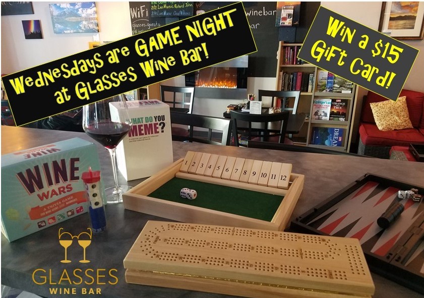 Cards Against Humanity? What Do You Meme? Cribbage? Shut the Box? Backgammon? LCR? Choose a table with a group and have a blast! Come on by and enjoy some wine while playing games with new or old friends. Game players can enter to win a $15 gift card.